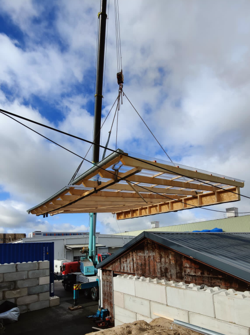 Aufgrund schwieriger Verhältnisse wurde das Dach ganzheitlich vorgefertigt und anschließend an Ort und Stelle verkrant.